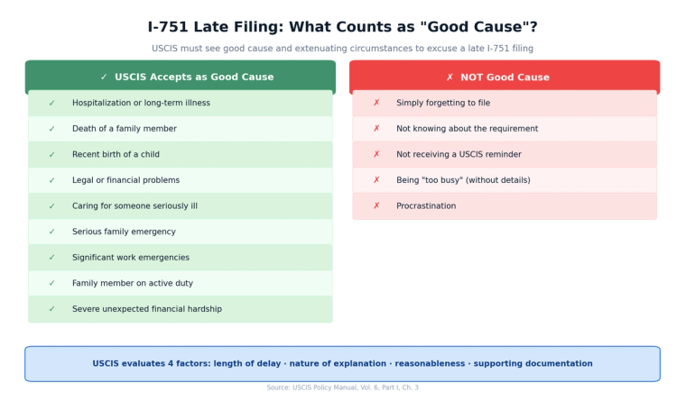 The regulation at 8 CFR § 216.4(a)(6) requires you to explain the good cause in writing. This is where your explanation letter comes in (covered in detail below).