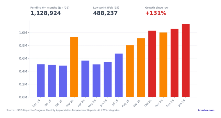 Immigration law changes frequently. We monitor USCIS policy updates and revise this guide when regulations change. Data sources: USCIS Report to Congress (Appropriation Requirement Monthly Reports, Dec 2024 through Jan 2026) and USCIS I-765 Quarterly Reports (FY2025 Q1 through Q3).